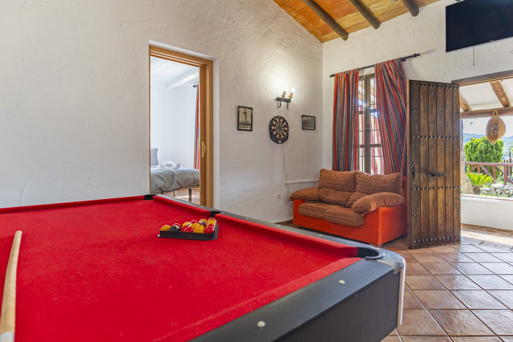 La vivienda cuenta con 5 habitaciones acogedoras, perfectas para alojar cómodamente a familias grandes o grupos de amigos. Dispone de dos cocinas completamente equipadas, ideales para preparar comidas en grupo o incluso organizar dos ambientes si se viaja con varias familias. Por favor, tenga en cuenta que el alojamiento no dispone de cuna ni de trona. El corazón de la casa es su amplio salón con chimenea de leña, que crea un ambiente cálido y hogareño para las noches más frescas. Para el entretenimiento, no puede faltar una mesa de billar, perfecta para tardes de juegos y risas. En el exterior, la finca ofrece zona de barbacoa, horno de leña, piscina privada y un entorno natural único con un pequeño arroyo que atraviesa la propiedad. Todo rodeado de vegetación, paz y aire puro.